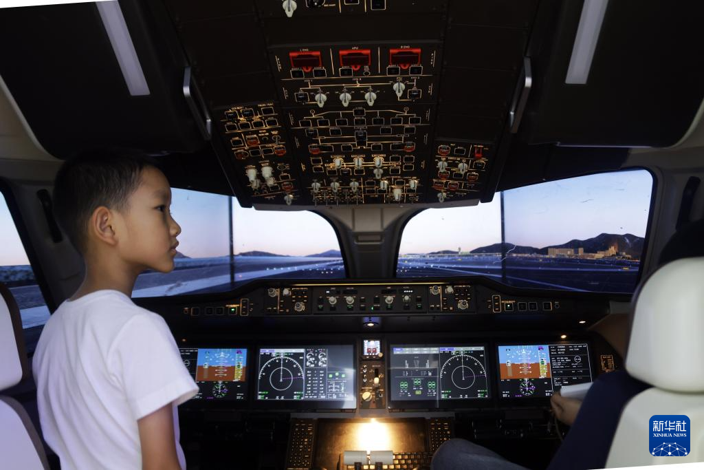 7月14日,一名小觀眾在科博會上參觀展出的C919大飛機模擬艙。