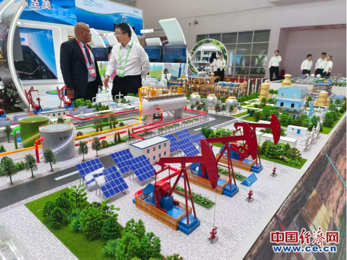 中國石化展區,工作人員與客商洽談。中國經濟網記者王婉瑩/攝