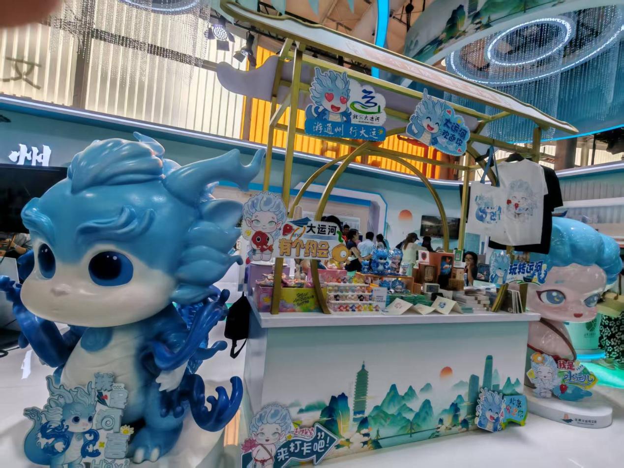 通州展區展示的由韓美林大師設計的“河喜”以及由泡泡瑪特設計的“水運兒”兩款大運河主題文創IP。中國經濟網記者楊秀峰/攝