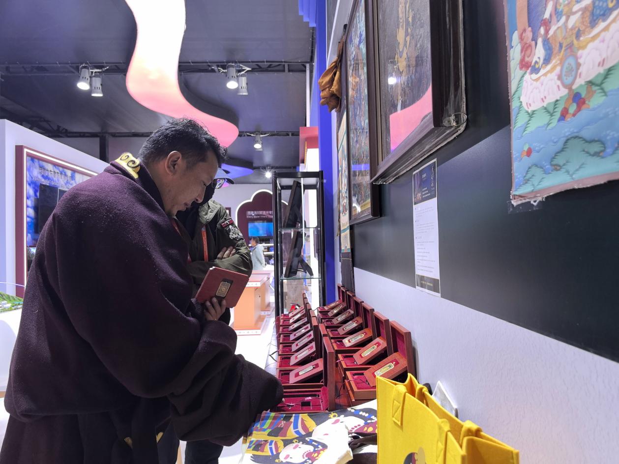 西藏館內,唐卡畫師正向觀眾細致介紹袖珍唐卡作品,展現非遺技藝的傳承與活力。 中國經濟網記者魏金金/攝