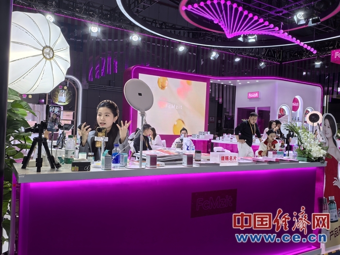圖為在復美滋(FcMzit)的進博會首秀展臺上,直播帶貨正在進行中。中國經濟網記者魏金金攝