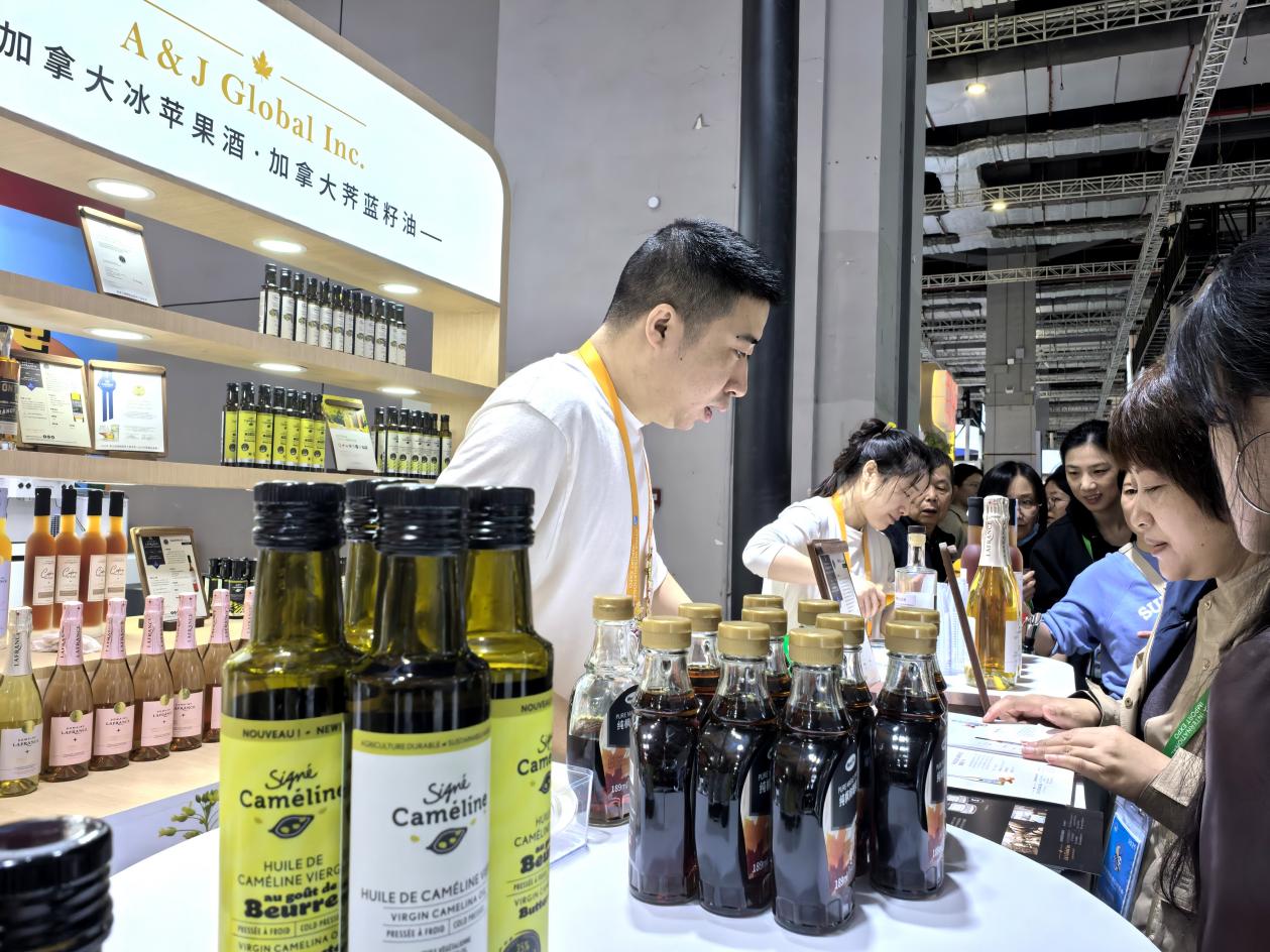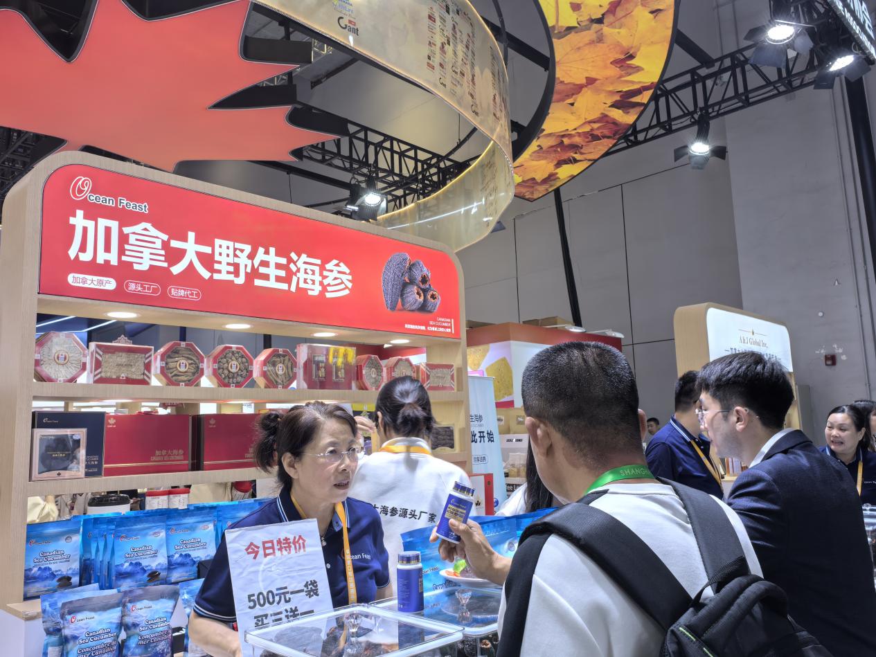 進博會上,加拿大農業食品館集中展示了糧油、肉類、乳品、酒飲等七大品類、近百種商品,其中不乏“洋土特產”大山行西洋參、加拿大知名寵食品牌Champion等。